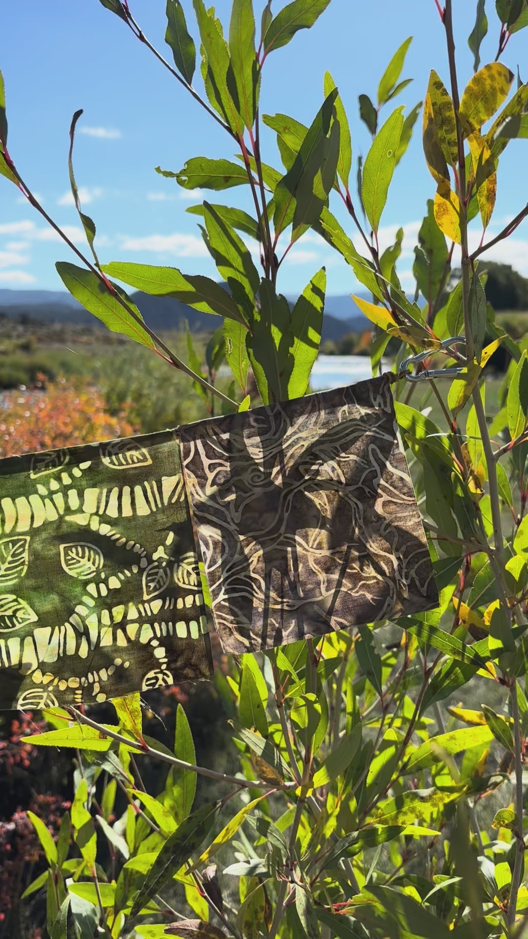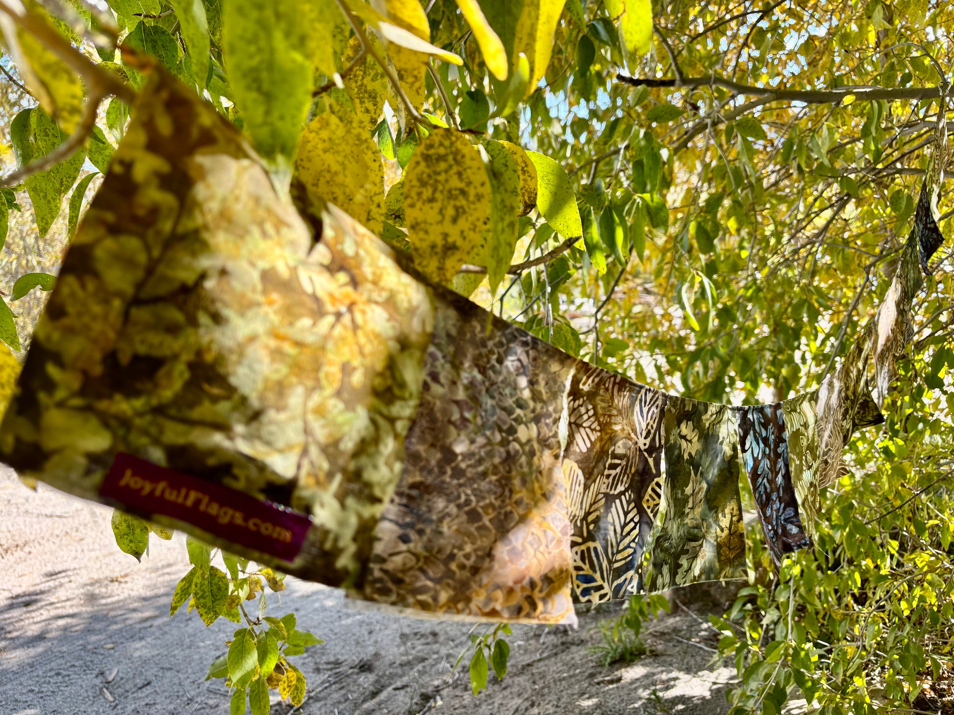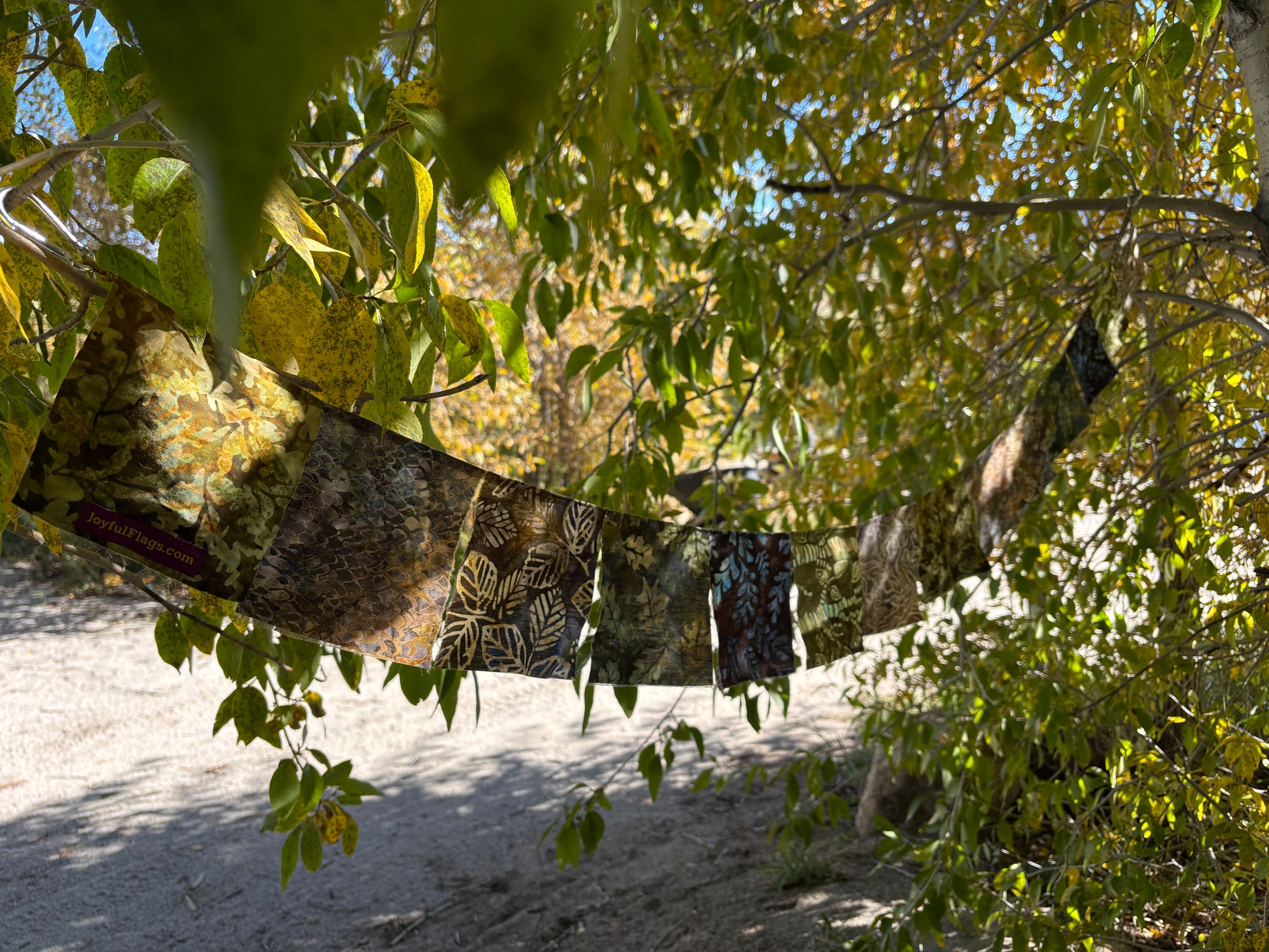 6ft long strand (fully extended) of rich EARTH TONE and BLUE GREEN fabrics to hang anywhere you feel joyful. The flags are hand glued with a durable fabric glue to two lines of colorful, organic hemp line. The flags come with mini metal clips for easy hanging. Each flag is approximately 4"x5". They are double sided batik cotton with vibrant colors and patterns. The flags are rough cut and are intended to fray slighting as they age.