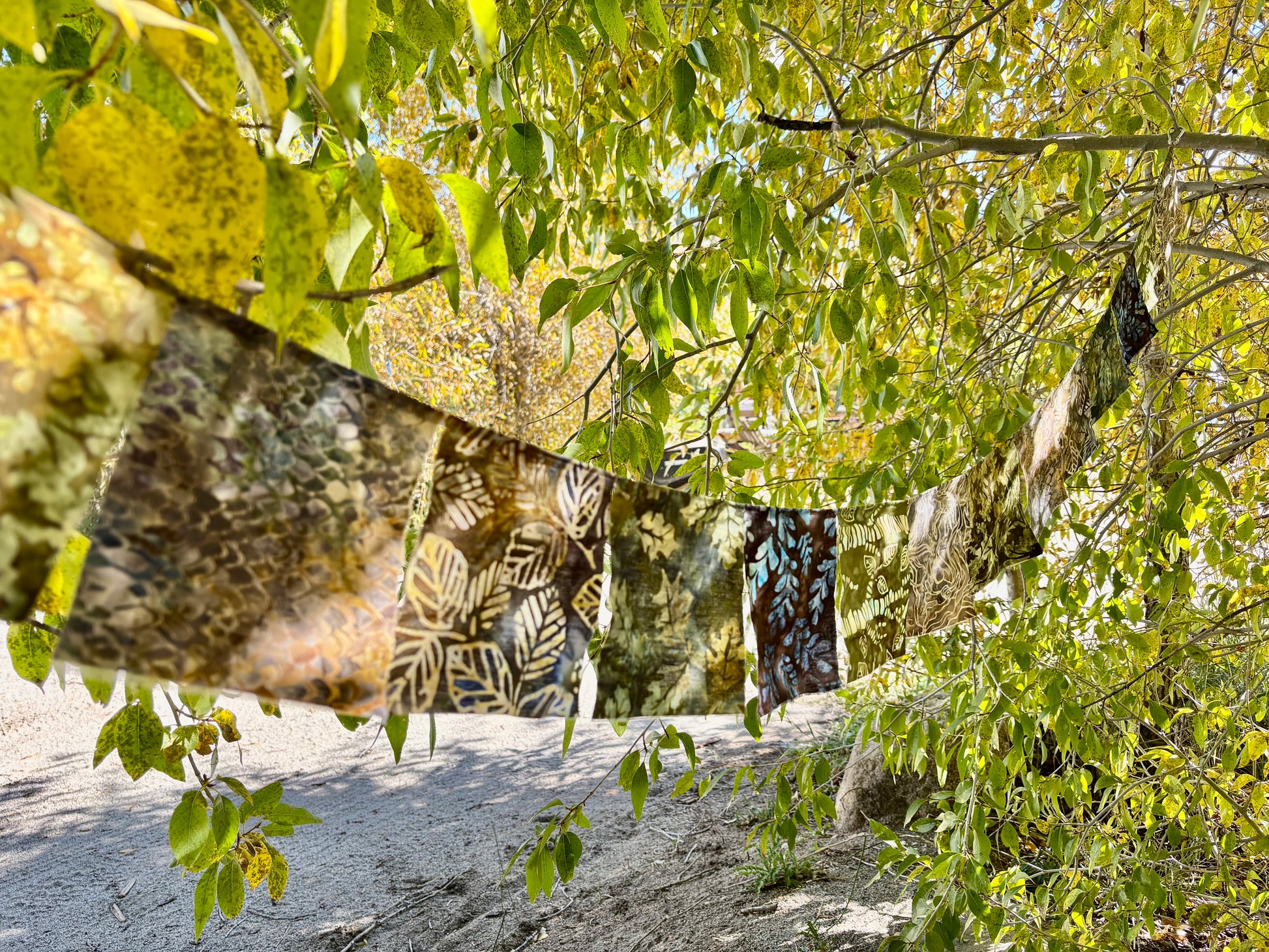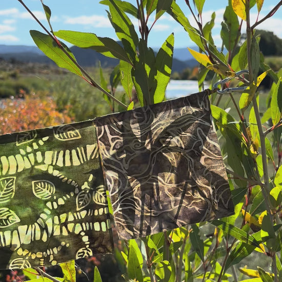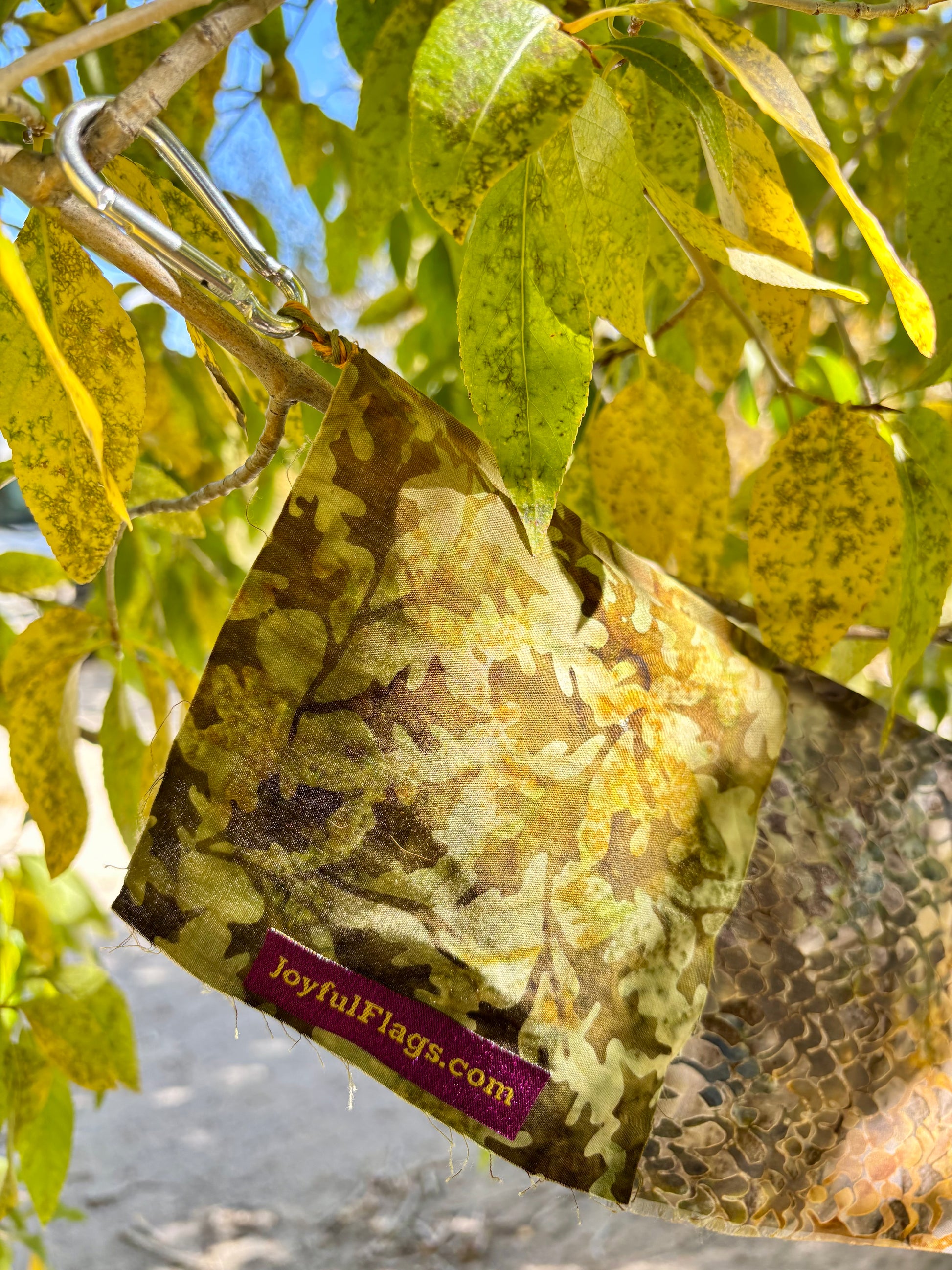 6ft long strand (fully extended) of rich EARTH TONE and BLUE GREEN fabrics to hang anywhere you feel joyful. The flags are hand glued with a durable fabric glue to two lines of colorful, organic hemp line. The flags come with mini metal clips for easy hanging. Each flag is approximately 4"x5". They are double sided batik cotton with vibrant colors and patterns. The flags are rough cut and are intended to fray slighting as they age.