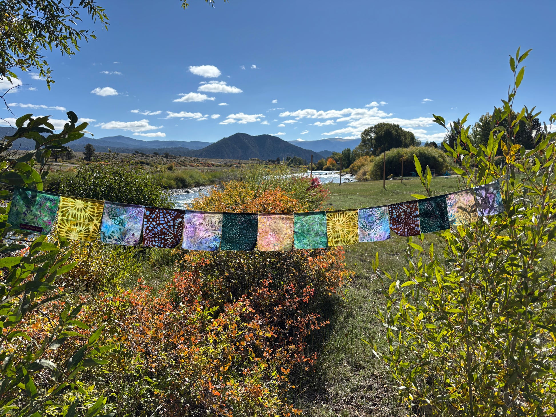 6ft long strand (fully extended) of Kaleidoscope fabrics to hang anywhere you feel joyful. The flags are hand glued with a durable fabric glue to two lines of colorful, organic hemp line. The flags come with mini metal clips for easy hanging. Each flag is approximately 4"x5". They are double sided batik cotton with vibrant colors and patterns. The flags are rough cut and are intended to fray slighting as they age.
